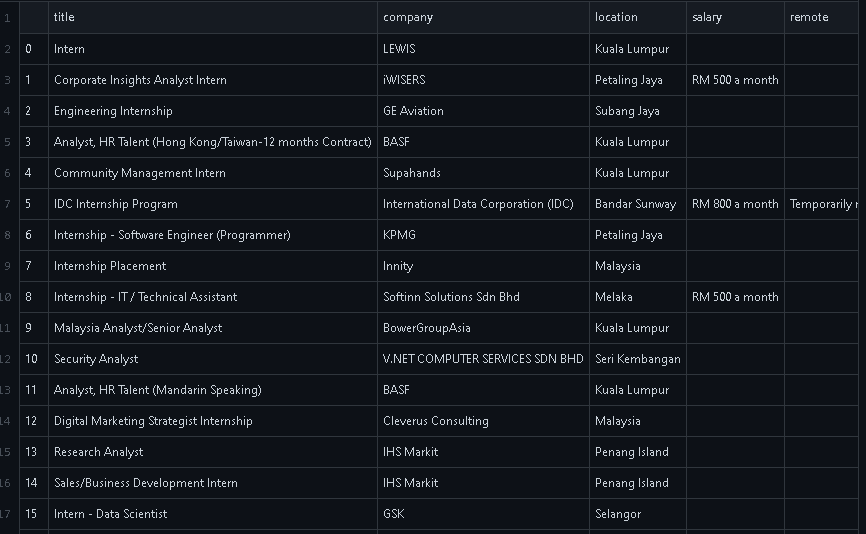 - Stored the output in a CSV file for easier comparing between different offerings in a single file without the need of opening many tabs or going back of forth in a tab. This helped us to filter out irrelevant offerings to us before proceeding to view for further information in the Indeed website and applying for the jobs.
